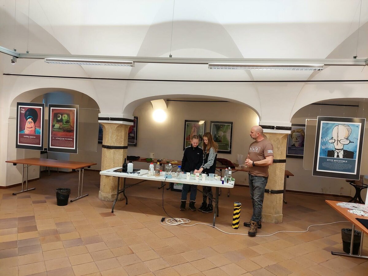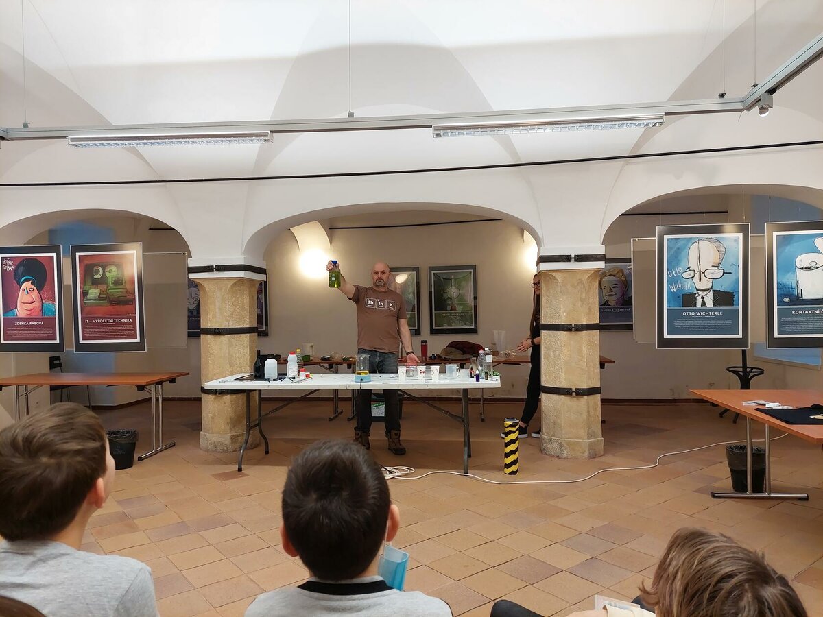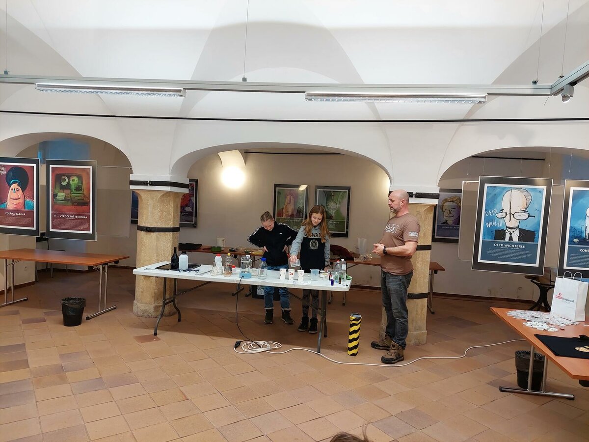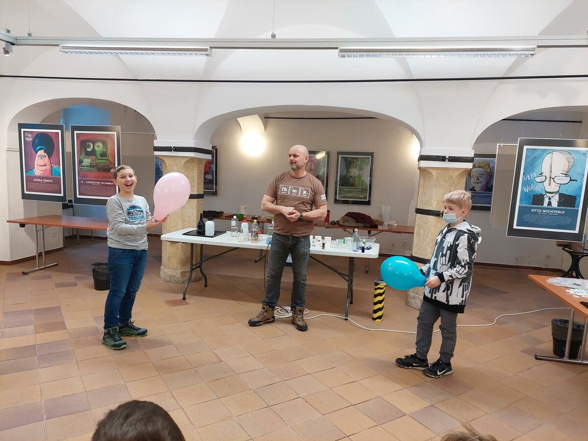 Chemie, pokusy? Slyšeli jsme zajímavé informace, máme nové zážitky, byli jsme nadšení. Neminuly nás ani drobnosti za odměnu. Robin s Lukášem jako nejlepší doplňovači informací získali triko. Děkujeme za zajímavý program.